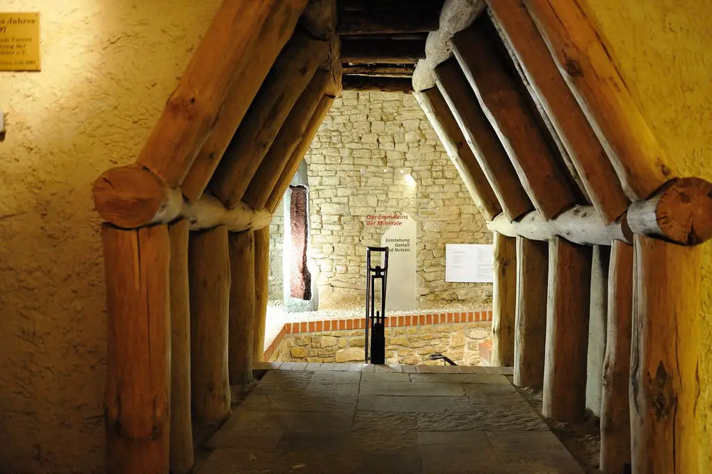 Arriba hay un gabinete histórico de historia natural y hallazgos raros del cercano depósito de mineral de uranio de Ronneburg.