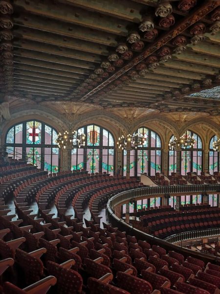 El interior del Palau está delicadamente decorado con patrones florales, creando un verdadero espectáculo visual. Además del salón principal, también encontrará un pequeño auditorio subterráneo de 600 asientos, mejor conocido como el Petit palauasí como un maravilloso restaurante llamado El Mirador del Palau donde pueda disfrutar de un buen almuerzo o cena antes o después de una actuación. Otras habitaciones que debe visitar son el impresionante vestíbulo y la hermosa Millet Sala Luis, que verá durante su visita guiada.
