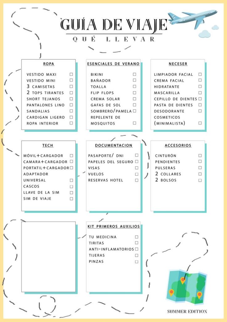 - Documentación: pasaporte, DNI, billetes y seguro de viaje.